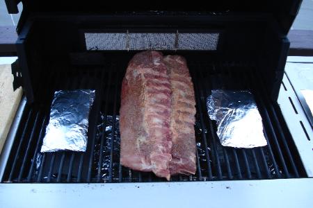 | Here is the set up with the smoke generators. Ribs are over the center burner that is NOT ON! Out side burners are on low to med. with smoke generators over those burners. |