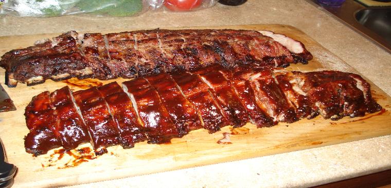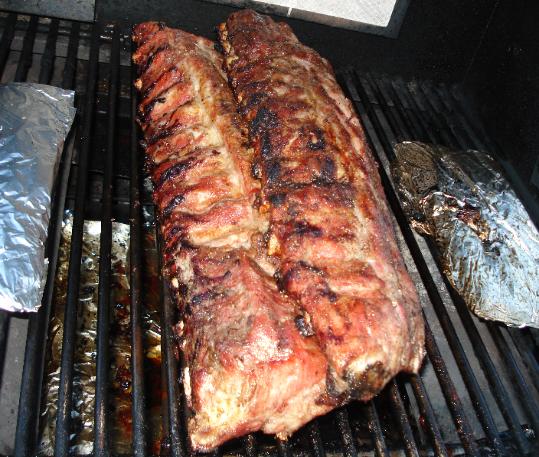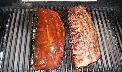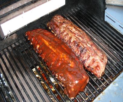 | After an hour and 15min. of flipping those ribs about every 15 min. they look like this and are ready for saucing. Like the rubs this can be done with so many differant flavors. I can only say a cheap BBQ sauce like Kr__t will only ruin all your hard work so far. You can even make your own or like my wife, no sauce but why? |