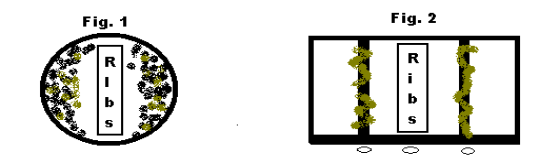 | Ribs need to be cooked slow and using indirect heat. This is done by placing coals on a charcoal grill on each side (fig. 1) or by turning on the outside burners on a gas grill (fig.2) in both these examples there is no heat source or fire directly under the ribs. Close the lid and cook about 1hr 15min. turning and flipping ribs every 15min. or so. |